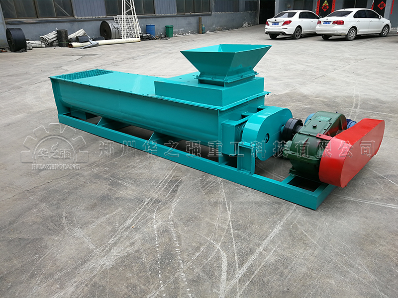 The double axis mixer is rotated through two groups of screw shafts with spiral blade, and water is added water to the powder material for spraying wet mixing transportation, so that powdery material can achieve controllable humidity. The equipment is mainly suitable for humidification and mixing of raw materials in the fertilizer industry, so that the materials are fully mixing and this machine have the function of conveying too. When the quantity of raw material is poured into the mixing tank from the outlet, the raw material is atomized by a number of water with relative pressure, which is stirred by the mixing shaft of the qualitative length to form a uniform water-containing core. The whole agitation is divided into three areas: atomization area, mixing area and discharge area. The agitator leaves have well wear resistance and long service life.